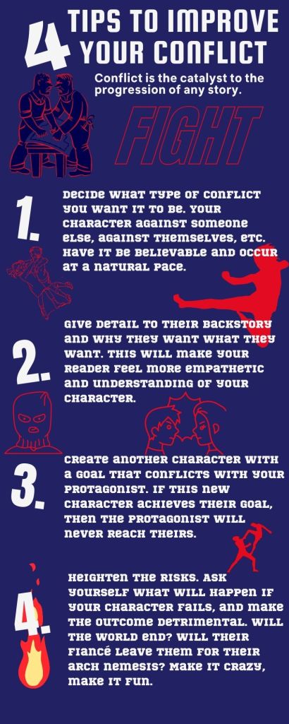 Most of the information is from an article named How to Create Conflict in your Novel. I have put the most important information in the infographic below.